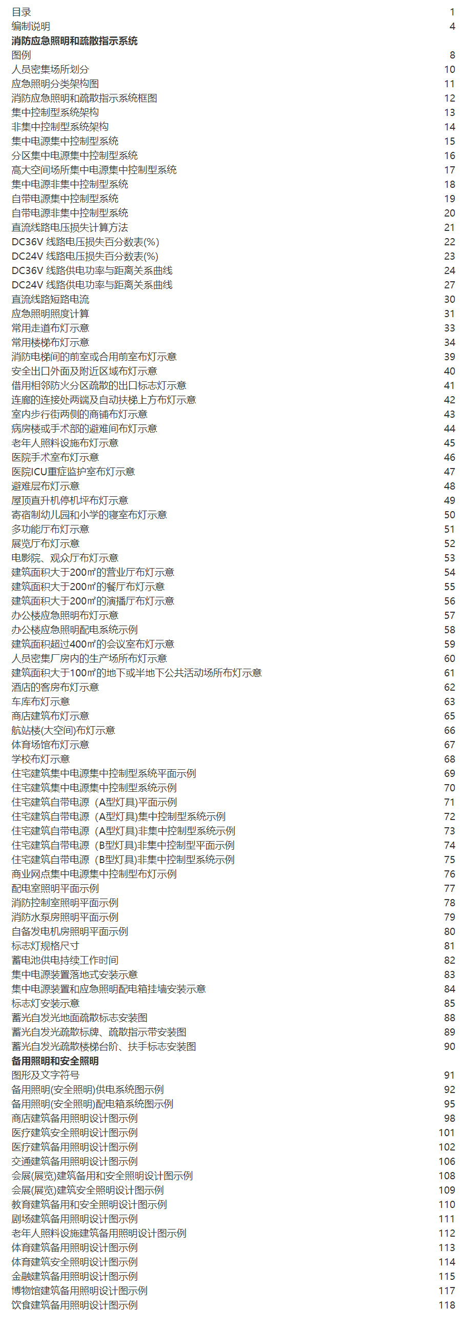 圖集適用于新建、改建和擴建的民用建筑、通用工業(yè)建筑應(yīng)急照明(疏散照明、備用照明和安全照明)的設(shè)計與安裝。具體內(nèi)容包括:消防應(yīng)急照明和疏散指示系統(tǒng)的圖例,系統(tǒng)架構(gòu),布燈示意,示例,安裝圖等,以及備用照明和安全照明的圖形及文字符號,系統(tǒng)圖示例,設(shè)計圖示例等。