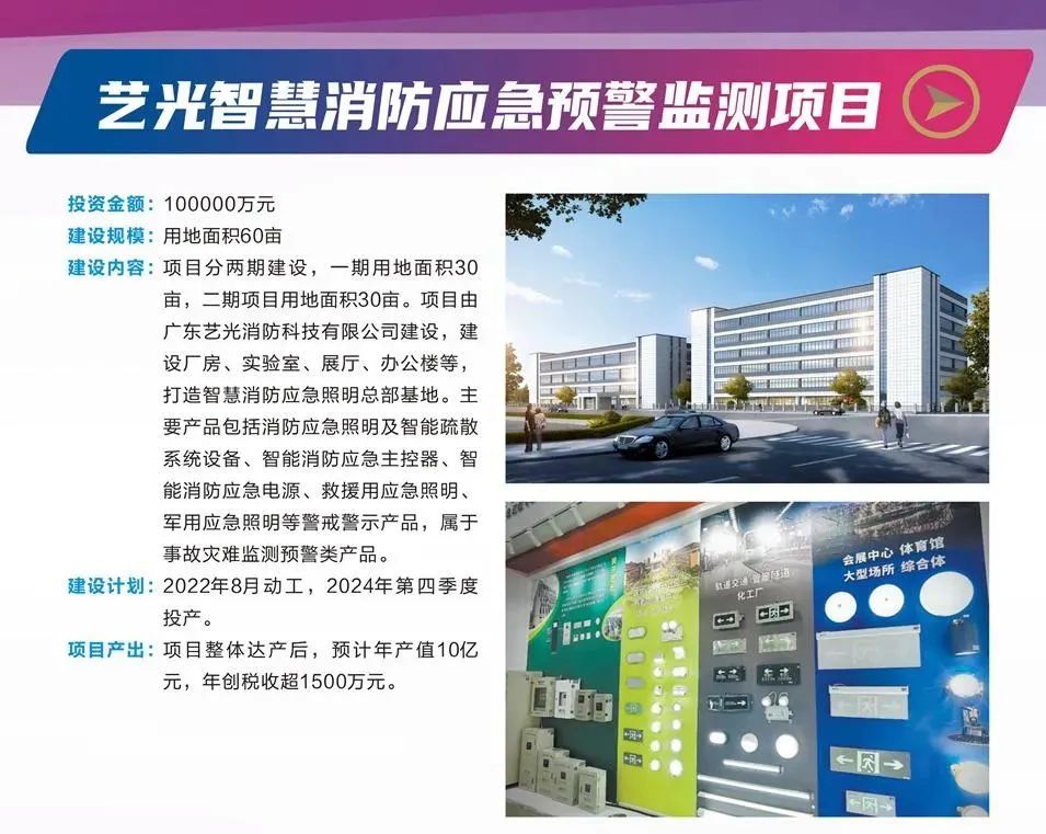藝光智慧消防應(yīng)急預(yù)警監(jiān)測項目投資金額100000萬元,建設(shè)規(guī)模60畝,分兩期建設(shè)包括廠房、實驗室、展廳、辦公樓等,將打造成智慧消防應(yīng)急照明總部基地。主要產(chǎn)品包括消防應(yīng)急照明及智能疏散系統(tǒng)設(shè)備、智能消防應(yīng)急主控器、智能消防應(yīng)急電源、救援用應(yīng)急照明、軍用應(yīng)急照明等警戒警示產(chǎn)品,屬于事故災(zāi)難監(jiān)測預(yù)警類產(chǎn)品,預(yù)計2024年第四季度投產(chǎn)。項目整體達(dá)成后,預(yù)計年產(chǎn)值10億元,年創(chuàng)稅收超1500萬元。