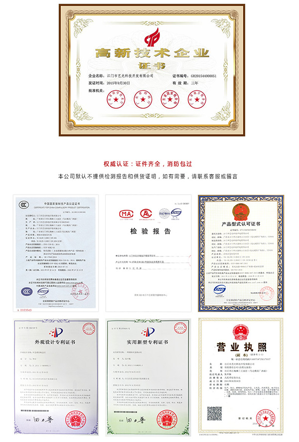 藝光科技15年的品牌實(shí)力,權(quán)威證書,資質(zhì)品質(zhì)全都有,15年的發(fā)展歷程中,藝光科技先后被評(píng)為國家高新技術(shù)企業(yè),江門市照明行業(yè)先進(jìn)企業(yè)等,同時(shí)藝光科技專注于做自己的品牌,設(shè)有專門的研發(fā)團(tuán)隊(duì),擁有五十多項(xiàng)專利。產(chǎn)品認(rèn)證齊全,輕松通過消防檢查。