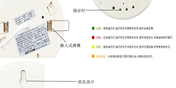 便利的細(xì)節(jié)它也有,方便掛于墻體的掛孔設(shè)計(jì),嵌入式夾緊彈簧,燈具狀態(tài)提示燈,這些細(xì)節(jié)讓你使用應(yīng)急吸頂燈更加便利。