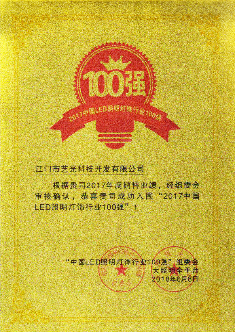 重磅發(fā)布丨藝光集團(tuán)入圍“2017年中國LED照明燈飾行業(yè)100強(qiáng)”