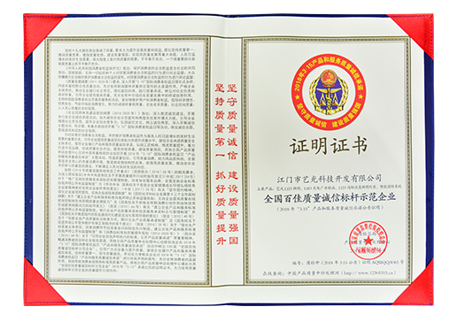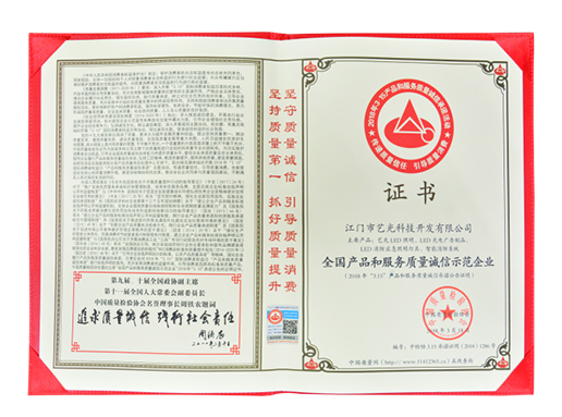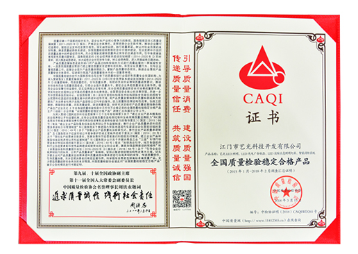 除此以外,中國質(zhì)量檢驗協(xié)會針對藝光在2015-2018年度2月經(jīng)營產(chǎn)品的檢定情況、生產(chǎn)條件以及售后服務(wù)進行了全面審查,授予“全國產(chǎn)品和服務(wù)質(zhì)量誠信示范企業(yè)”,并認定藝光品牌LED照明、LED光電廣告制品、LED消防應(yīng)急照明燈具、智能疏散指示應(yīng)急照明系統(tǒng)等全系列產(chǎn)品為“全國質(zhì)量檢驗穩(wěn)定合格產(chǎn)品”。