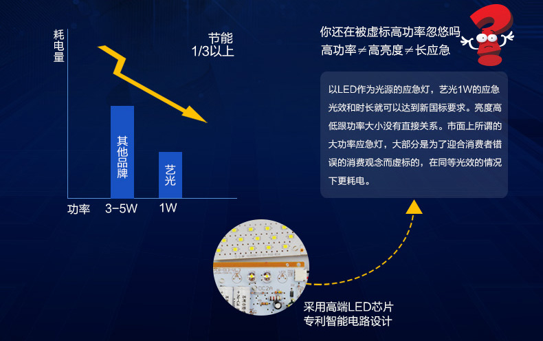 1、低功率、高亮度,更高效節(jié)能,藝光消防應急筒燈1612只需要1W的功率,便可以達到新國標要求,更穩(wěn)定、高效,亮度與功率沒有直接關系,這也是為什么藝光消防應急筒燈1612只有1W的功率去可以做到高亮度發(fā)光的原因!